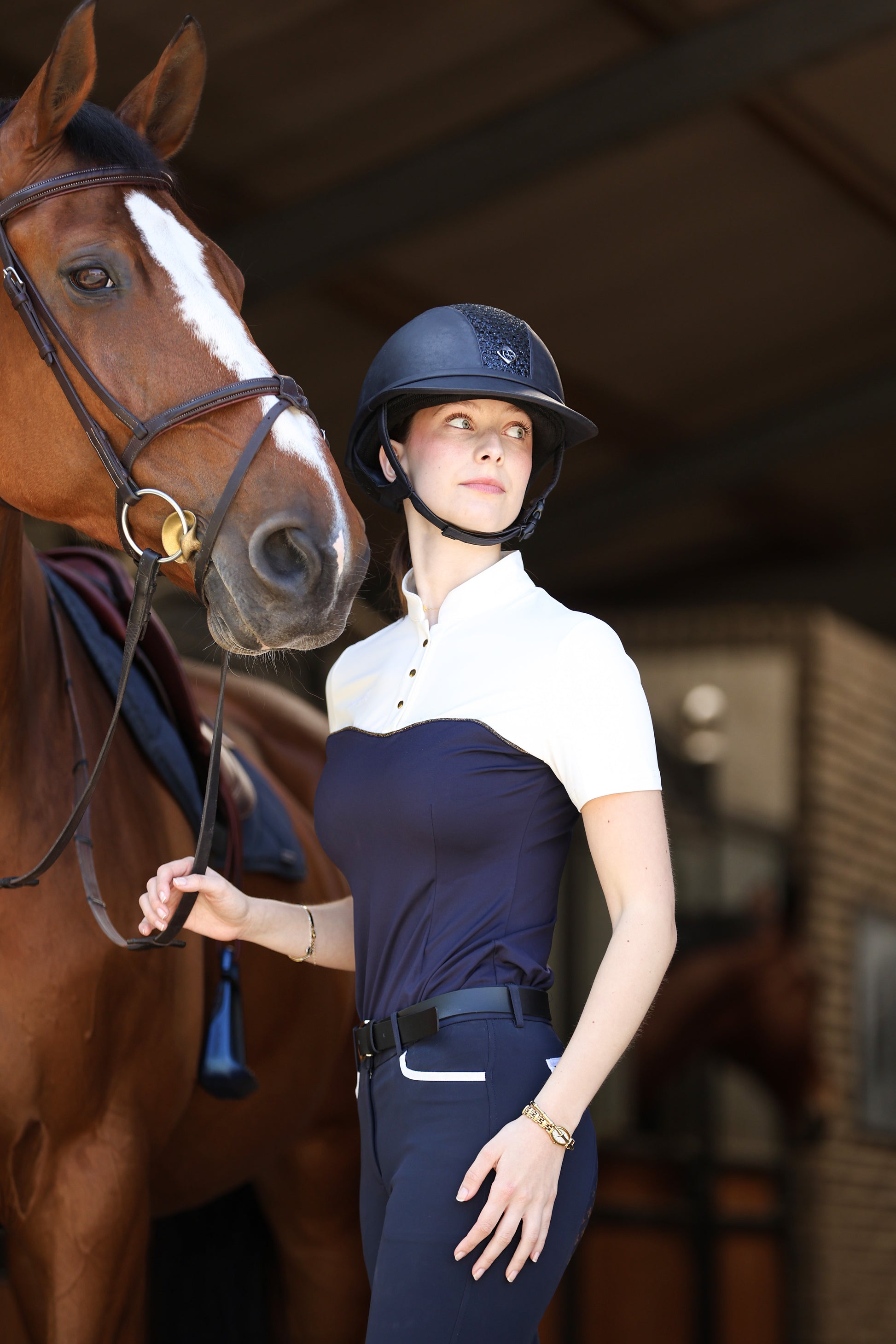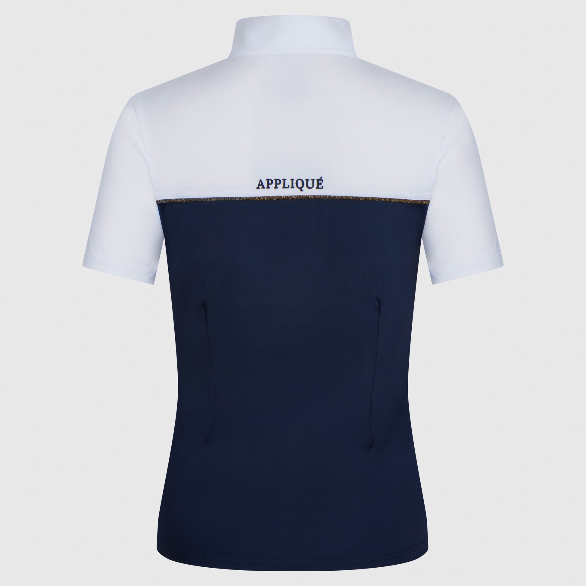 Classy and elegant competition shirt with golden decorative details and a feminin design.