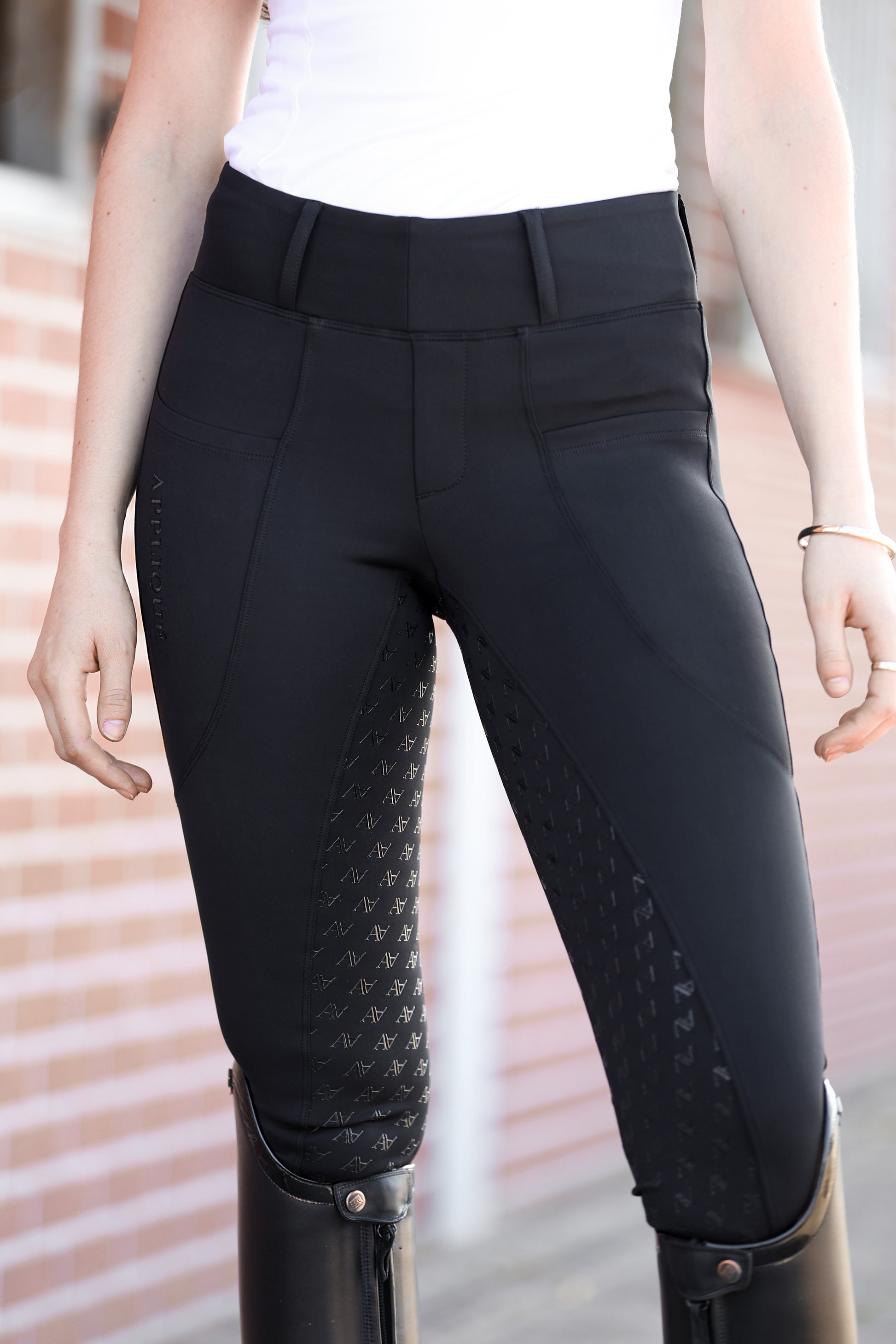 Black ridingleggings for woman with two phone pockets.